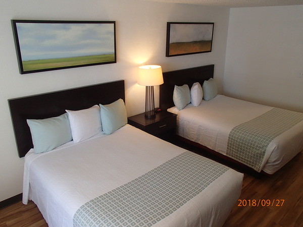 The room features: Two queen beds, Free Wi-Fi, TV, In room safe, mini fridge, microwave, coffee maker, sitting area, bathroom, balcony. Free Parking.
