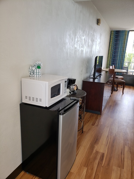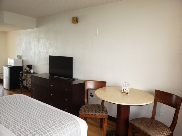 The room features: Two queen beds, Free Wi-Fi, TV, In room safe, fridge, microwave, coffee maker, sitting area, bathroom, patio/balcony. Free Parking.