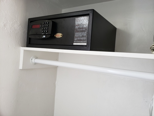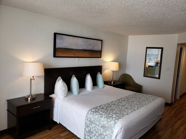 This Room Features: One king bed, in room safe, sitting area, bathroom, patio balcony. "full kitchen" that includes pots and pans, dishes, glasses, utensils, full-sized refrigerator, microwave, toaster, Free Wi-Fi , Free Parking.